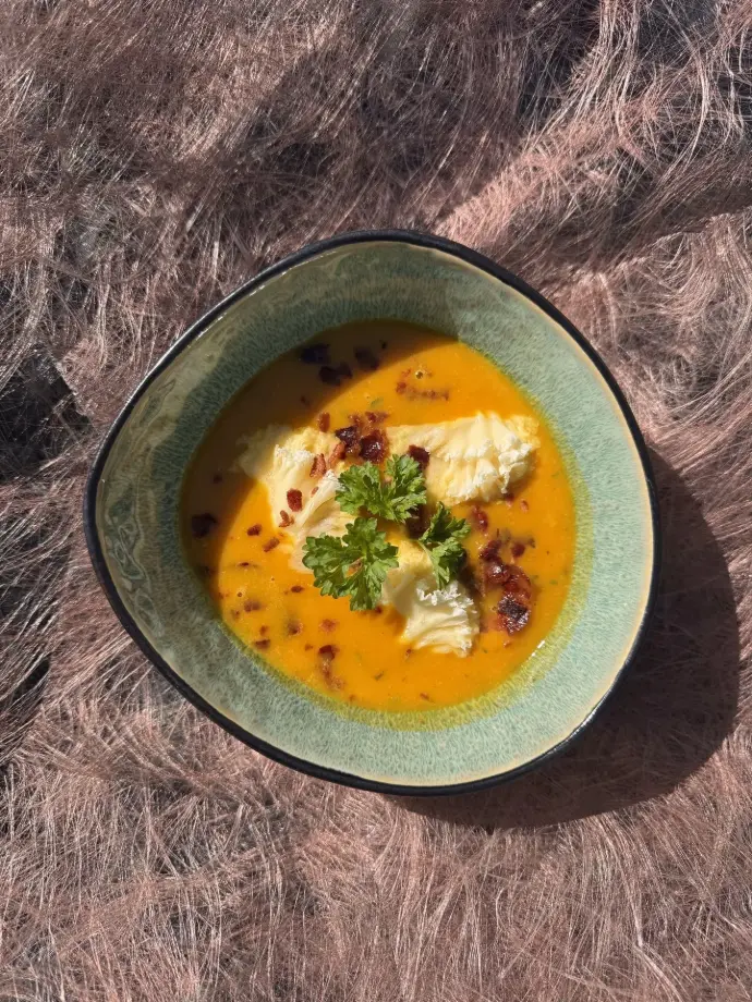 Serre chaud : Verse dans des bols, décore d’un filet de lait de coco, d’un tour de poivre et d’une feuille de sauge.